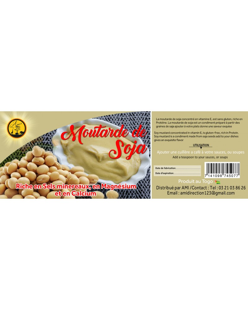 La moutarde de soja concentré en vitamine E, est sans gluten, riche en Protéine. La moutarde de soja est un condiment préparé à partir des graines de soja ajouté à votre plats donne une saveur exquise.Ajouter une cuillère à café à vos sauces, ou soupes