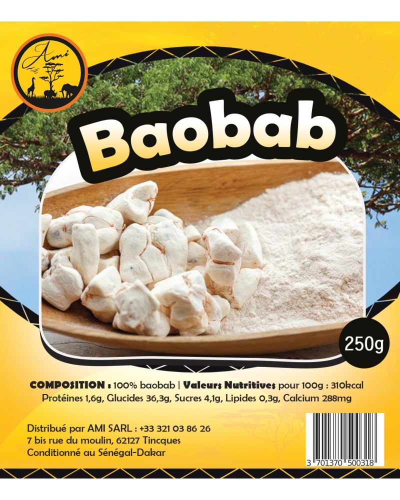 Le fruit du baobab, aussi appelé « pain-de-singe » est très apprécié par ces derniers. Sous sa coque rigide, le fruit renferme des graines enveloppées de pulpe blanche. Utilisée sèche, la poudre de baobab est un complément alimentaire bio et naturel. Elle contribue au rééquilibrage des fonctions principales du corps, apporte énergie, bien-être et renforce les défenses immunitaires.